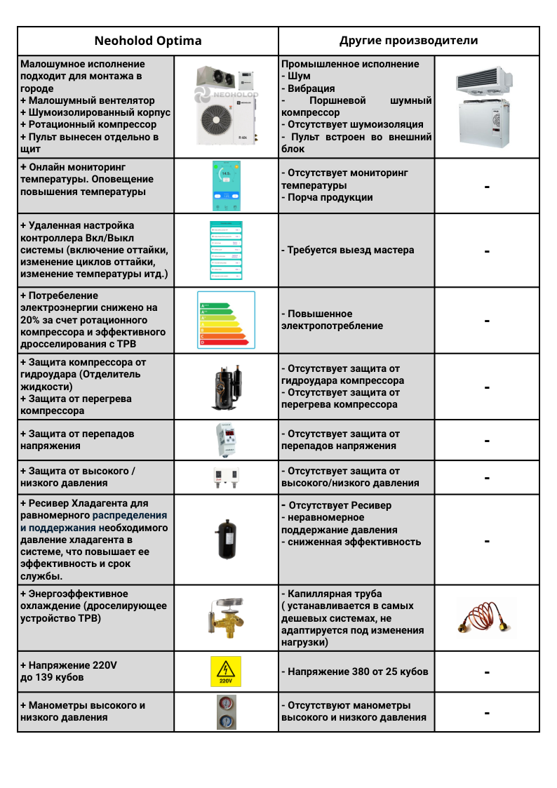 Таблица подбора холодильной сплит системы Neoholod Optima 2.4